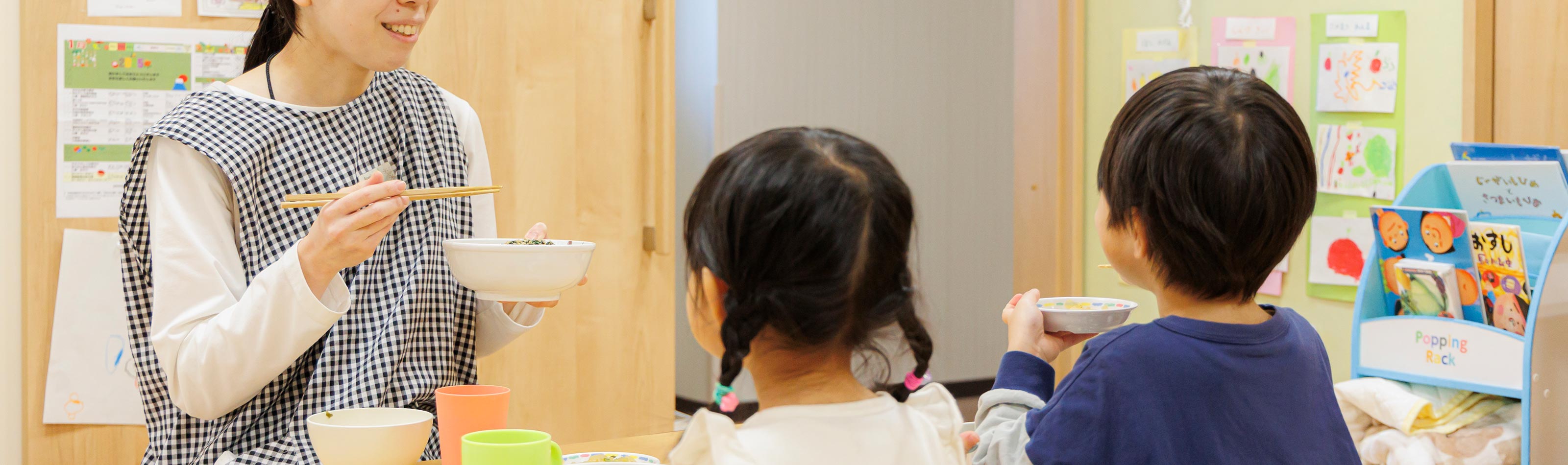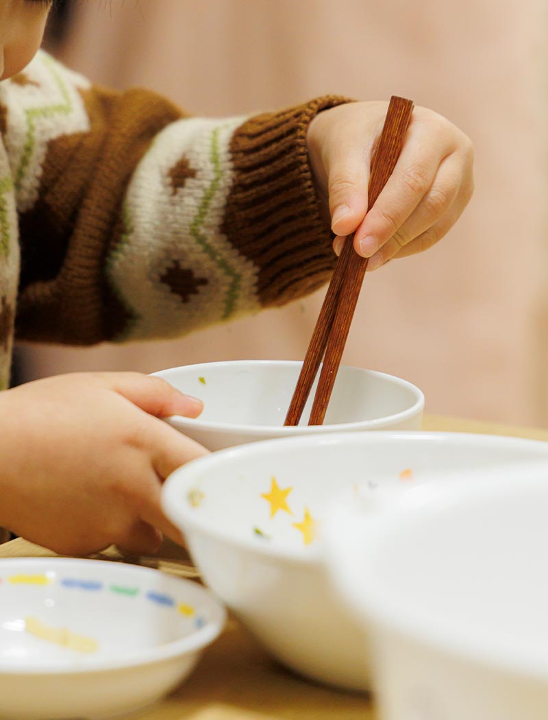 乳児にはゆったりとした環境で授乳を行い、6ヶ月頃からは「スプーンに慣れる」ことを目標に離乳食を進めます。1歳3か月未満では「食べることへの意欲」を育て、2歳未満では「食材への興味」を引き出すことを目標としています。2歳頃には「意欲的に食事に取り組む姿勢」を養い、3歳頃には「食べる楽しさや喜びを知る」ことを目標に、一人ひとりに寄り添った食育を進めていきましょう!