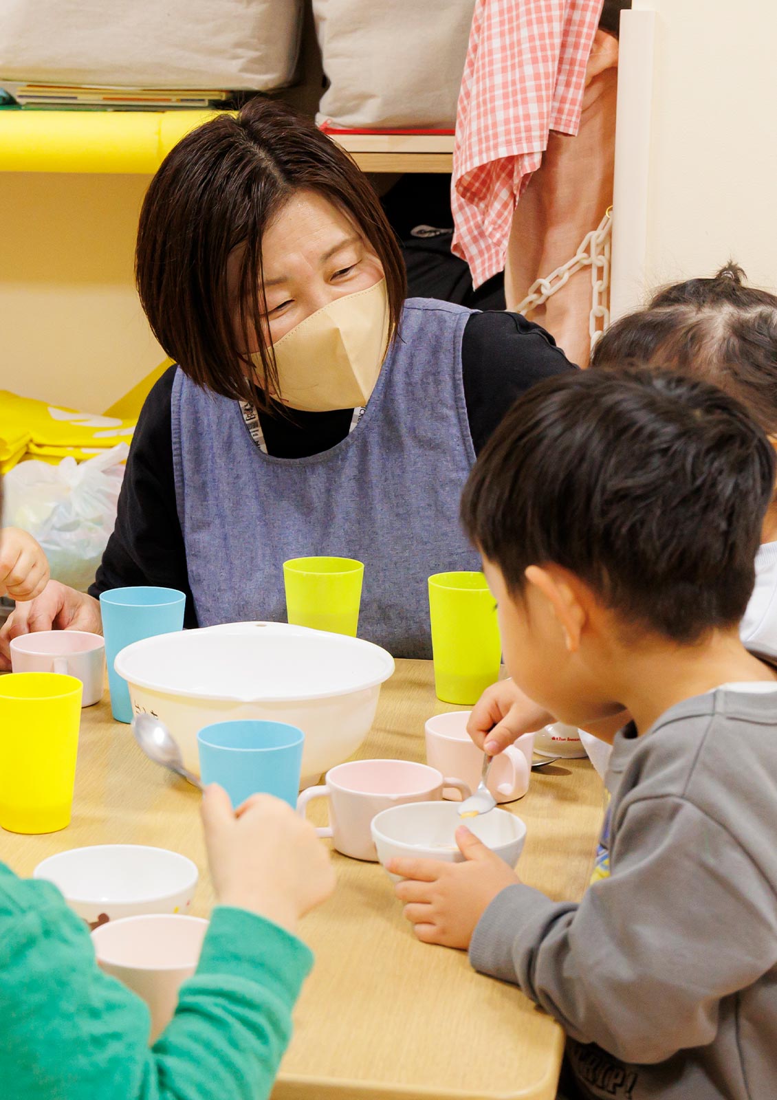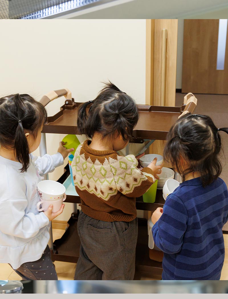 食物アレルギーのある子どもには、保護者の方と相談しながら除去食などの個別対応を行うことで、できるだけみんなと一緒に食事を楽しめるように配慮しています。また、職員全員がアレルギーに対する知識を身につけることで、机や椅子・食事の位置、歯ブラシやコップの配置まで徹底した管理を実施。誰もが安心して食事ができる環境づくりに取り組んでいます。