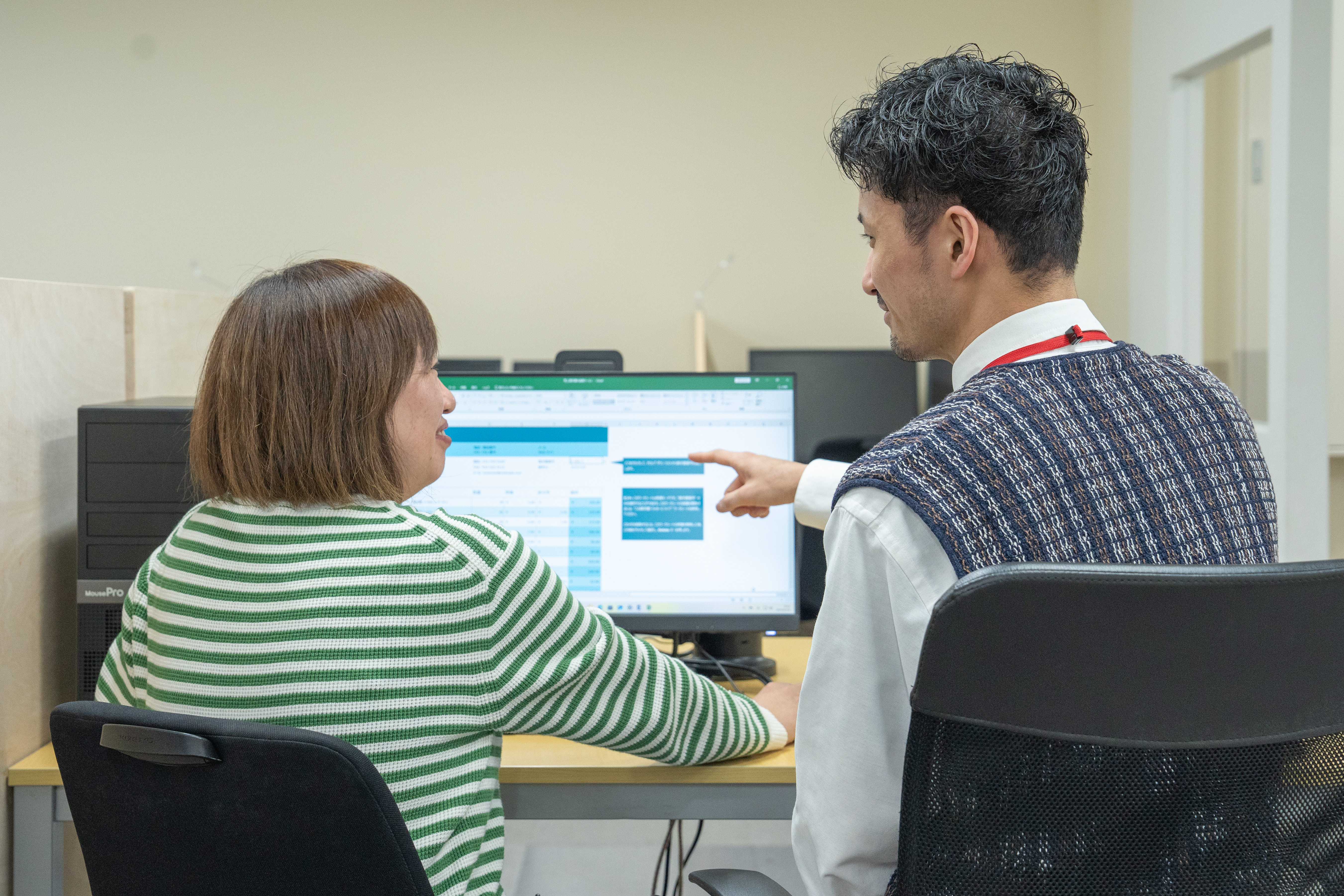 あなたにお任せする仕事は、利用者さんがパソコンを使って働けるようサポートすること。具体的には、利用者さんの業務指導や振り分け、仕事の進捗・様子の把握、納品管理と多岐にわたります。ほかにも、支援計画書の作成など福祉関連の業務もお任せ。福祉の仕事やIT以外のスキルも、一から丁寧にお教えしますので安心して飛び込んできてください。
