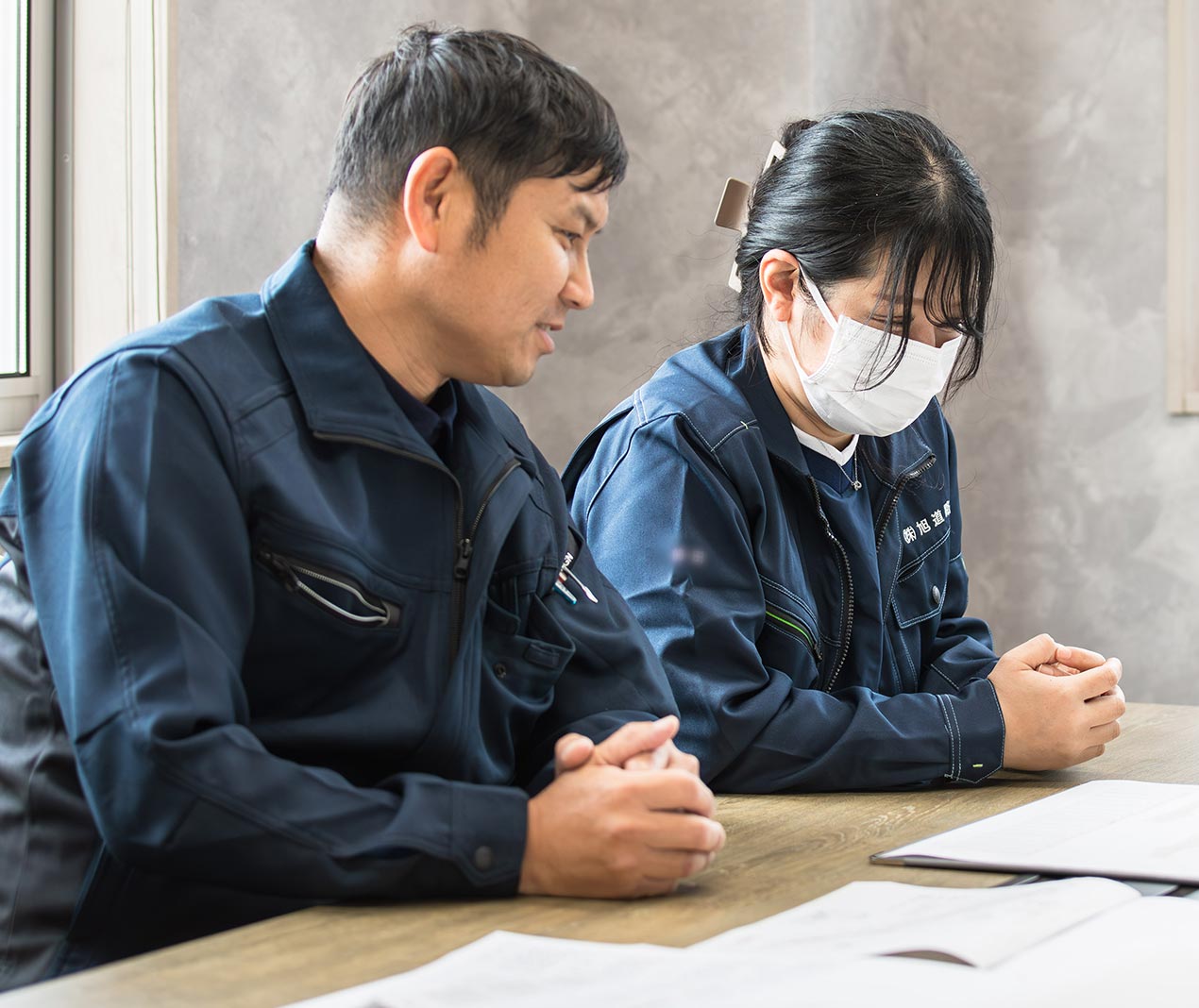 現在、20代から60代まで幅広い年代のスタッフが男女・国籍問わず活躍中です。チームワークを大切にする社風があり、困ったことがあれば気兼ねなく相談できる環境が整っています。また、従業員の安全と幸福を最優先に考えており、人間関係も良く、安心して長く働ける職場です。
