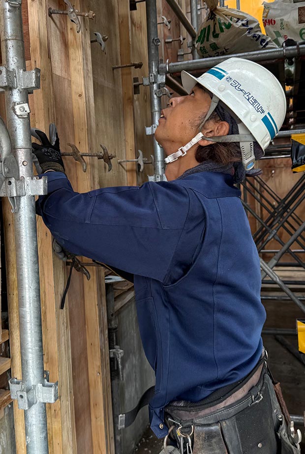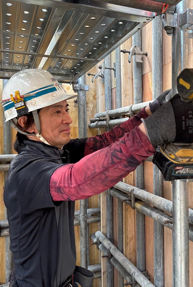 私たちの仕事は、鉄筋コンクリート造の建物をつくるための「型枠」を製作することです。設計図にもとづいて木材を加工し、現場で正確に組み立て、コンクリートを流し込んだあとに型枠を解体するまでが全体の作業となります。