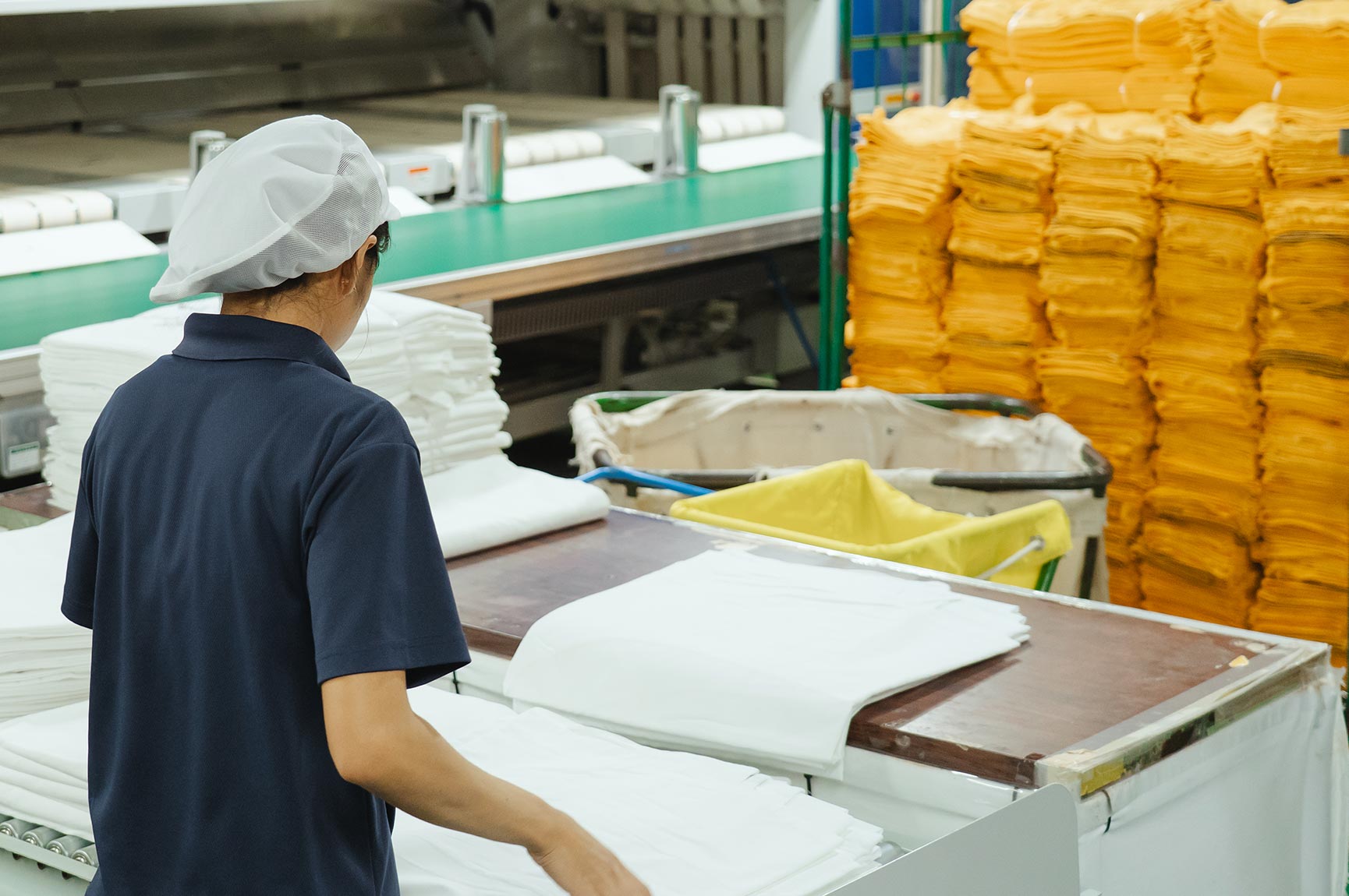 私たちの提供するリネンサプライ及び、ユニフォームレンタル事業とは、自分たちの手で清潔に仕上げた製品を、ホテルや食品工場などの施設へ供給すること。衛生的で、快適な人々の暮らしを維持するために必要不可欠な領域です。そのため、季節によって繁閑の差はあっても、景気の影響を受けづらく、製品の需要は常に安定しています。創業以来築き上げたお客様との信頼関係も、この事業を支える重要な柱の一つです。事業の継続性そのものが、私たちの社会的価値の証明になる。そう信じて、私たちは日々進化を続けています。