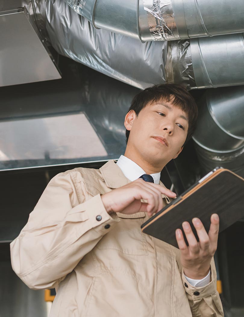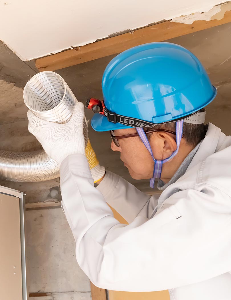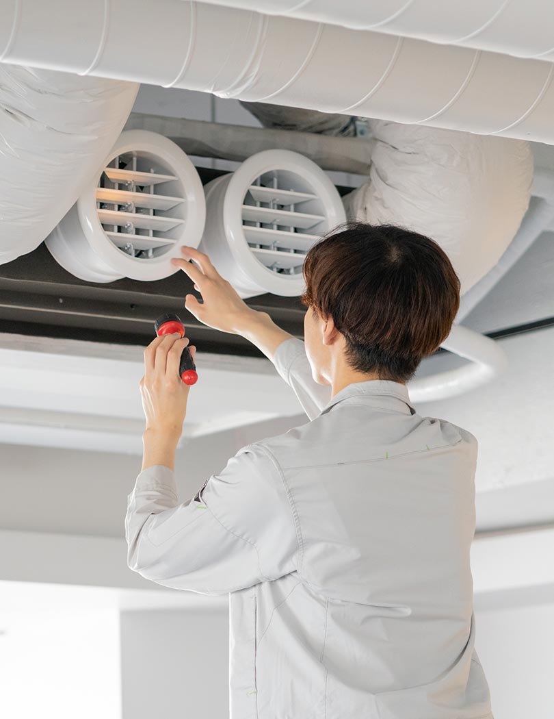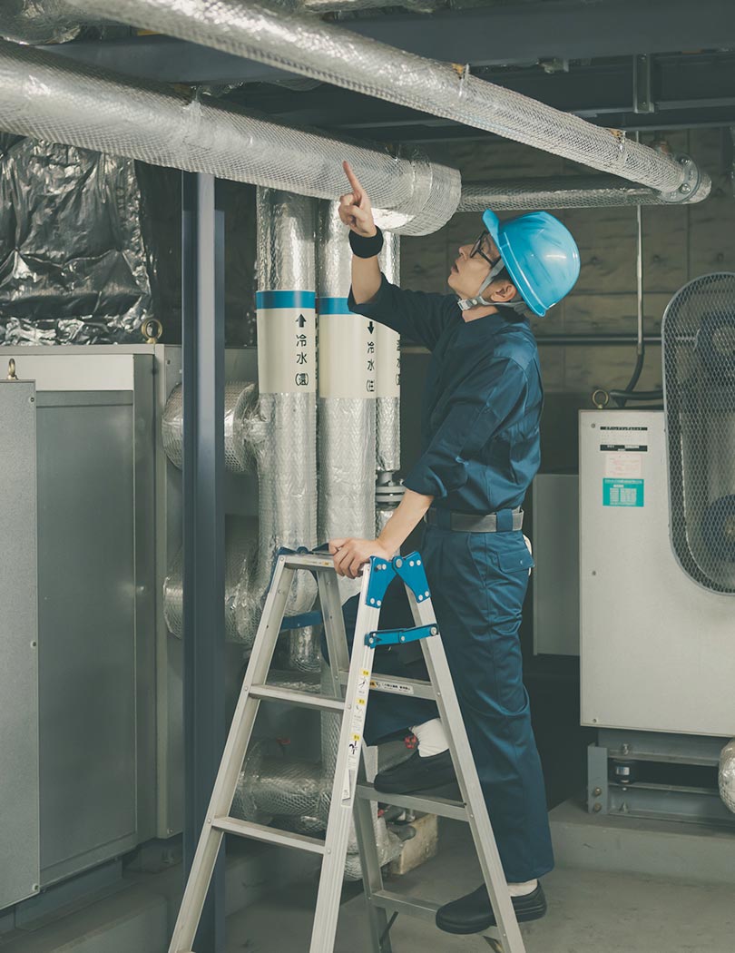 建物の快適性や機能性を根幹から支える空調設備。その中でも、特に重要なのが、空気の通り道を作る空調ダクトです。私たちは、その設計・施工を専門として、創業から半世紀以上、その技術に磨きをかけてまいりました。毎日学校に通う子どもたちや病院で治療を受ける患者の方、オフィスビルで働く人々。それぞれの空間に最適な空気環境を創出するため、私たちは、建物の用途や規模、構造に合わせた施工方法を日々研究しています。とはいえ、多くの場合、空調ダクトは天井裏などに隠れているため、普段の生活で人々の目に触れることはありません。しかし、「人々の暮らしを支える」という重要な役割を担っているからこそ、一つひとつの仕事に責任と誇りをもって、日々精進し続けられるのです。