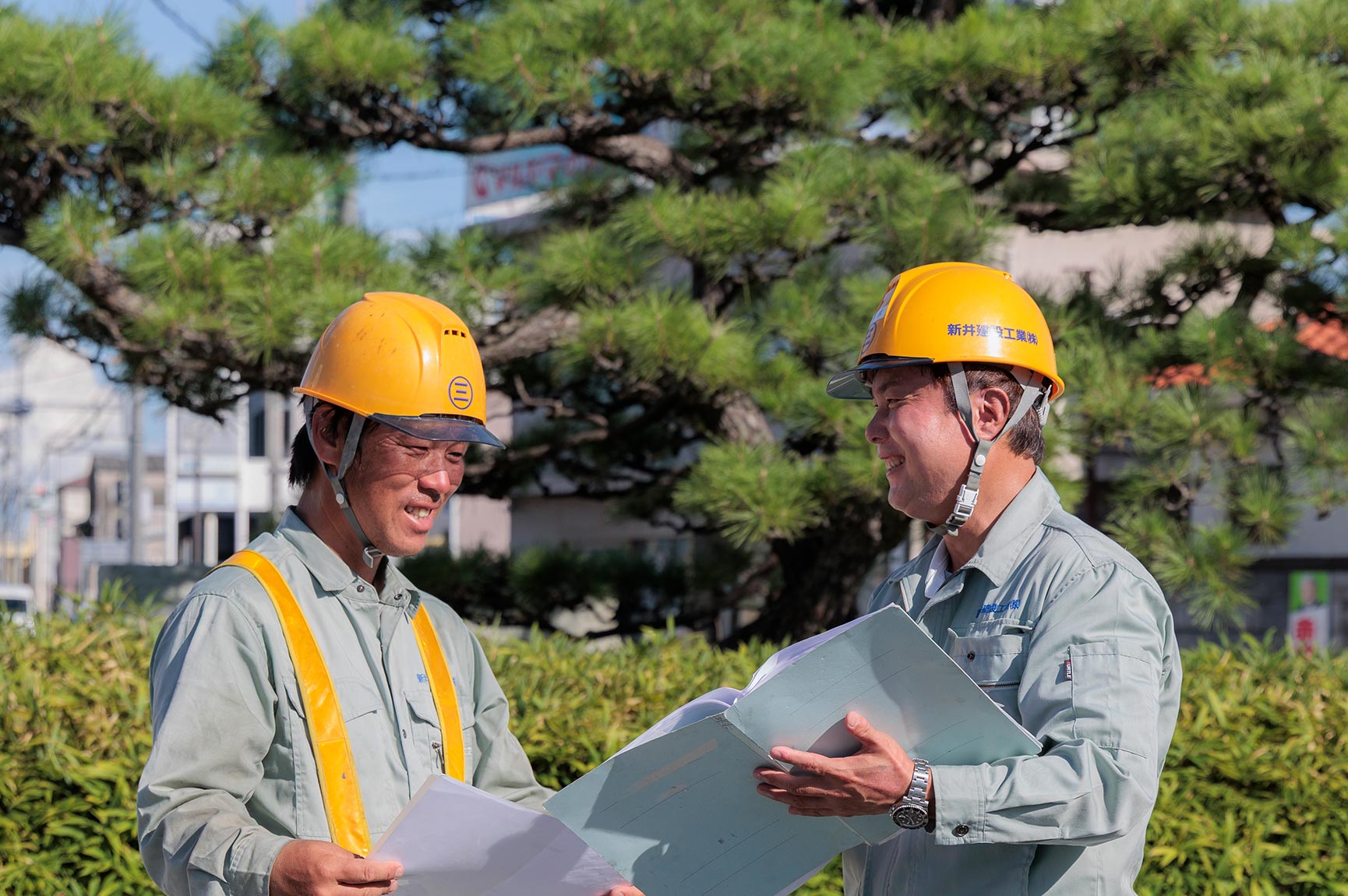 が実現する連携力「人の和・技術の輪」——この理念は、私たちの業務を支える大切な価値観であり、創業以来変わることのない信念です。各社員が案件に責任を持って担当しながらも、決して一人で抱え込むことはありません。工事規模に応じて複数の担当者が協力し、経験豊富なベテランから若手への技術継承が行われています。この社内横断的な協力体制は、個人の成長と組織の発展を同時に実現。さらに、協力会社との関係性も誇りです。「新井建設工業の依頼なら」と快く協力してくださる強固な協力体制は、長年築き上げてきた信頼関係の賜物。「人の和」と「技術の輪」が織りなすつながりが、当社ならではの迅速かつ柔軟な対応力の源です。