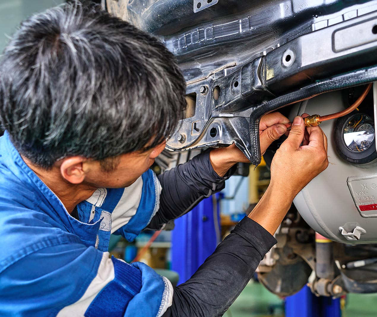 この社会インフラを支えるため、当社はデンソーダイアグステーション認定店として高度な専門性を追求し、法人向け車両の点検や修理に特化することで、他社にはない安定した事業基盤を築いてきたのです。また、全国的にも数社しか手掛けていないLPGバイフューエル車の製作・販売まで、部品の調達から開発、製作を一貫して自社で行う、独自の技術力が私たちの大きな強みです。