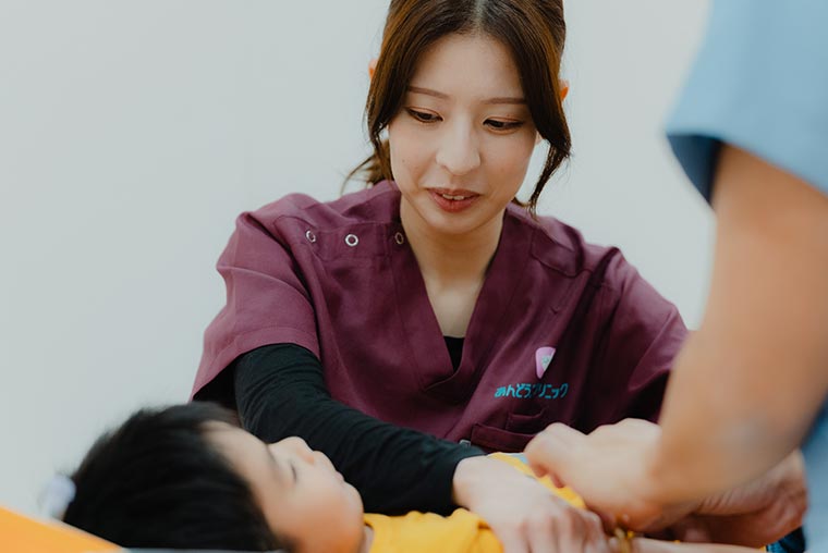 当クリニックの看護業務は、乳児健診や予防接種、問診、服薬指導などを通して、お子様とご家族に寄り添うことを大切にしています。特に乳幼児期の診療では、保護者の方が不安を感じている場面も多いため、共感や思いやりをもった対応で“まずは安心してもらう”ことを重要視しています。その結果、「ありがとう」「聞いてもらえて助かりました」といった感謝の言葉をいただくことも少なくありません。単純な医療技術だけでなく、優しさや思いやりの心が“やりがい”へと変わっていきます。