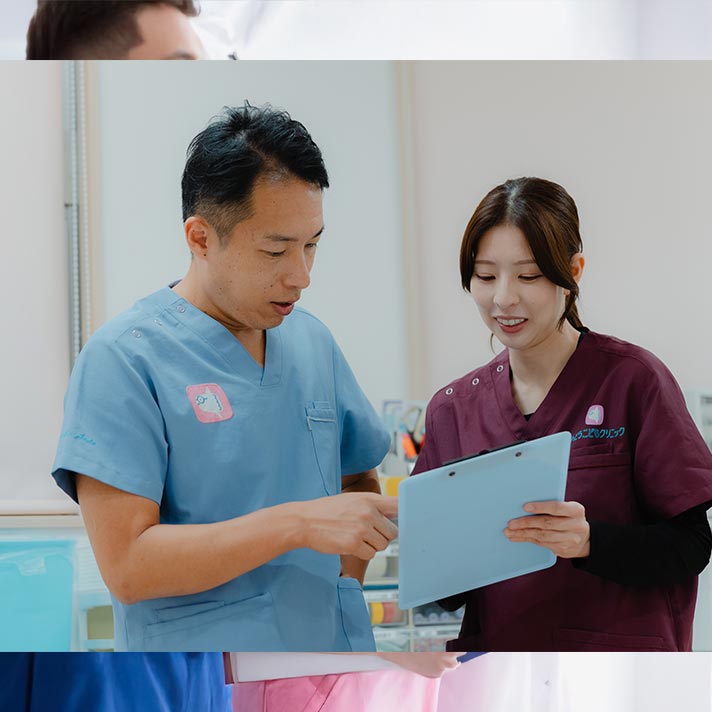 20代から50代まで、幅広い年齢層の看護師が活躍しています。中には、子育てを理由に一度現場を離れ、パート勤務を経て正社員に復帰したスタッフも。それぞれのライフスタイルや事情を理解し合える環境が整っているため、たとえば、「子どもが急に熱を出してしまって…」といった場合でも、柔軟に対応できるような助け合いの体制が自然と機能しています。「それでも申し訳ない…」といった不安をお持ちの方でも大丈夫。当院なら、どんな事情があろうとも、チームの一員として迎え入れてくれる、あたたかな風土があります。無理せず、自分らしく働ける。そんな安心感を、きっと実感していただけるはずです。