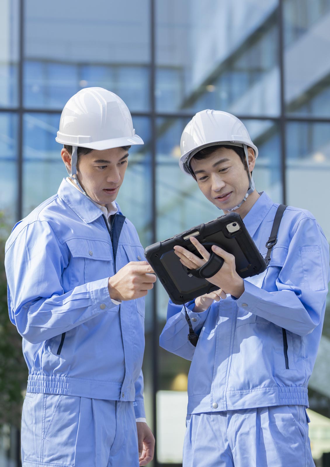 当社では、業務支援システムを導入し、タブレット端末での図面確認や報告書作成を実施することで、効率的な業務体制を構築。これにより、お客様への迅速な対応とサービス品質の向上に繋げています。また、お客様の幸福だけでなく、取引先や従業員など、関わるすべての人の幸福を追求し、社員が安心して技術を磨けるよう、労働環境の改善にも継続して取り組んでいます。