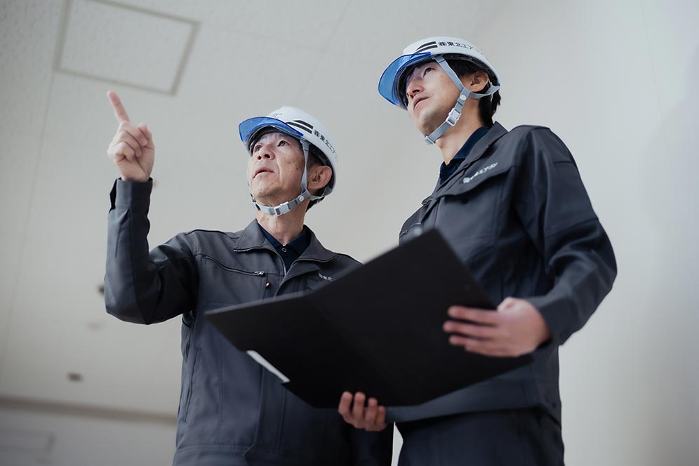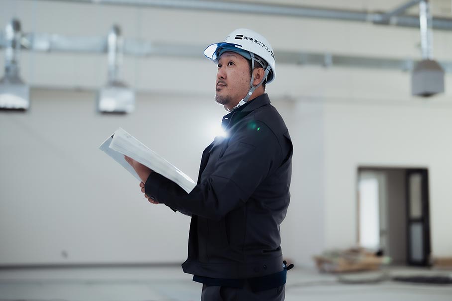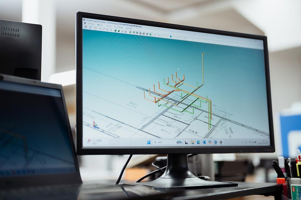 当社の強みは、積算から施工図作成、現場指導までの工程をワンストップで提供できることです。長年かけて培ってきた技術力と実績に加え、CADを駆使した高度な施工図作成技術が、このような一貫した対応を可能にしています。さらに、ゼロエネルギーに関わる工事など、時代のニーズに合わせた新たな事業を展開している最中です。今後も、公共工事から民間の建物まで幅広い建築機械設備工事を手がけ、社会に貢献してまいります。