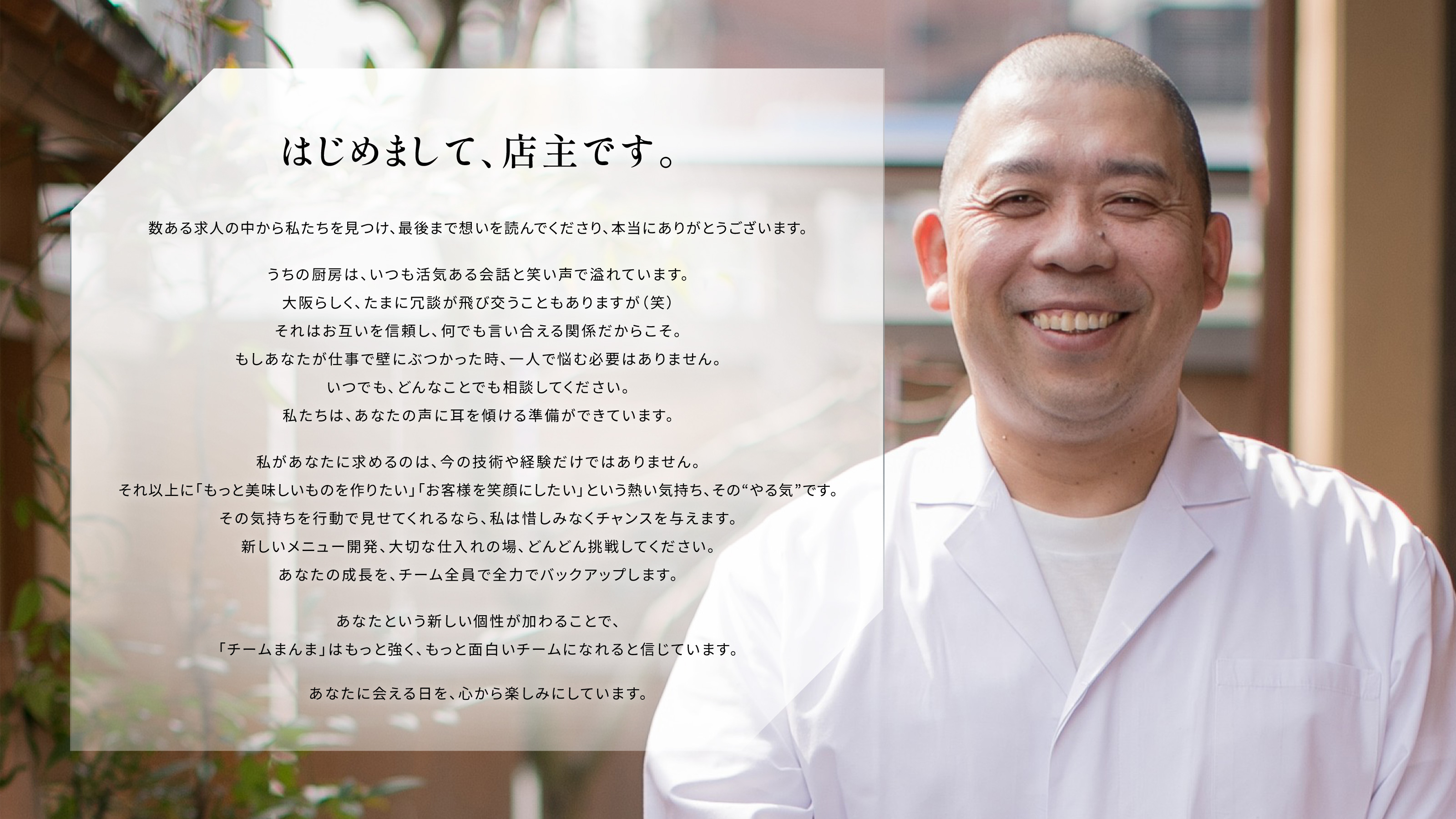 A. 純粋に料理が好きな方、そして「お客様に喜んで欲しい」と心から思っている方と一緒に働きたいです。