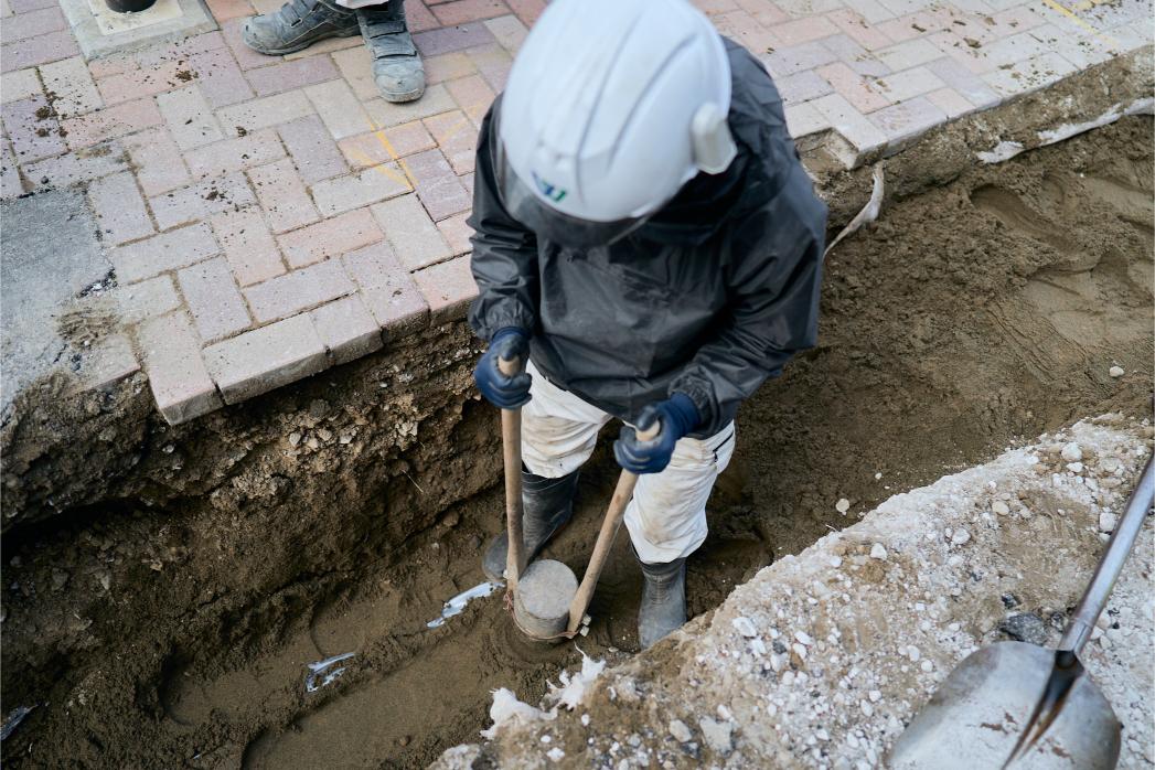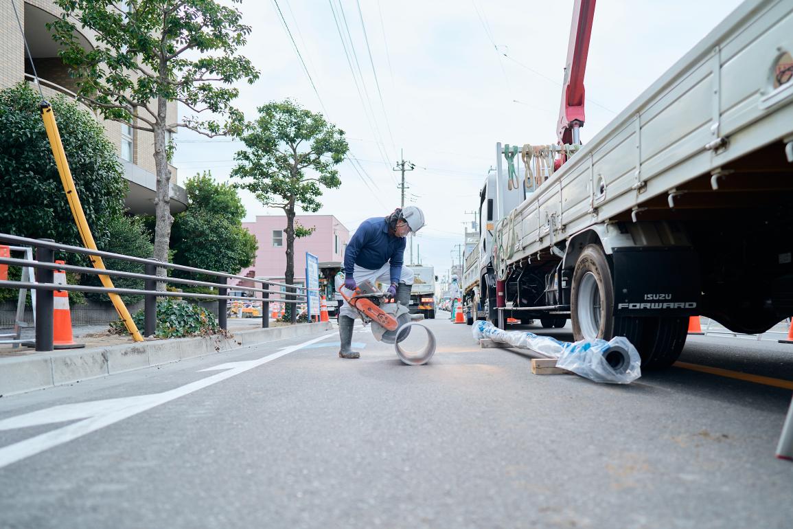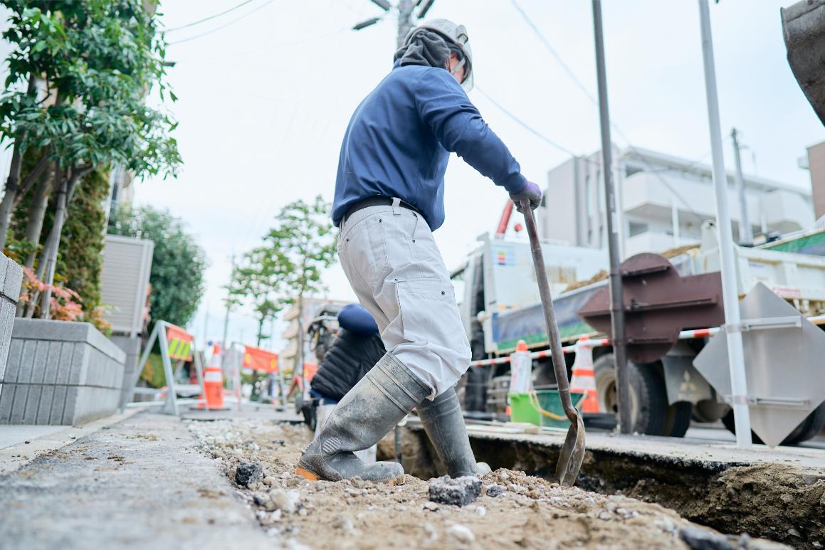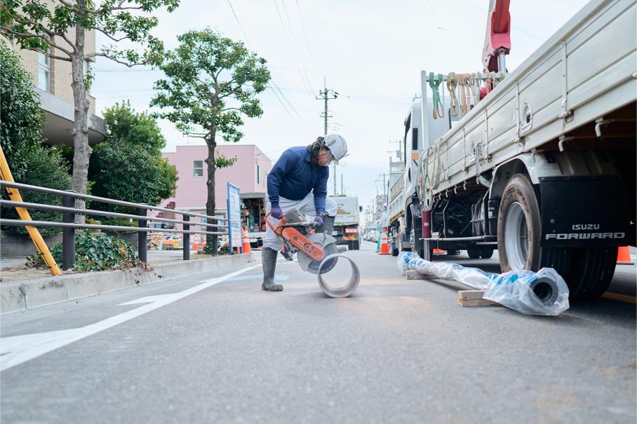 道路規制から重機による掘削、水道管の撤去や新設、埋め戻し、道路復旧まで、すべての工程を一貫して担当します。