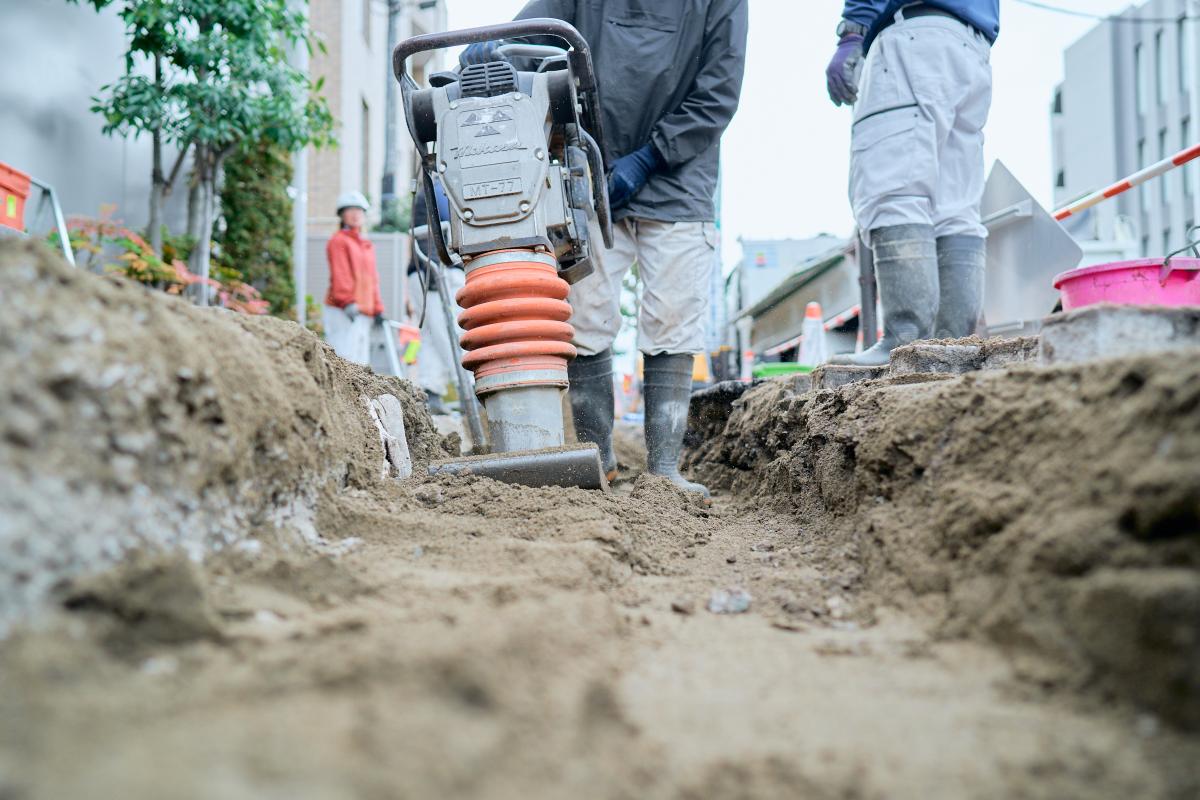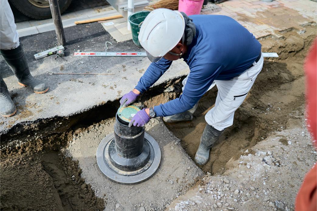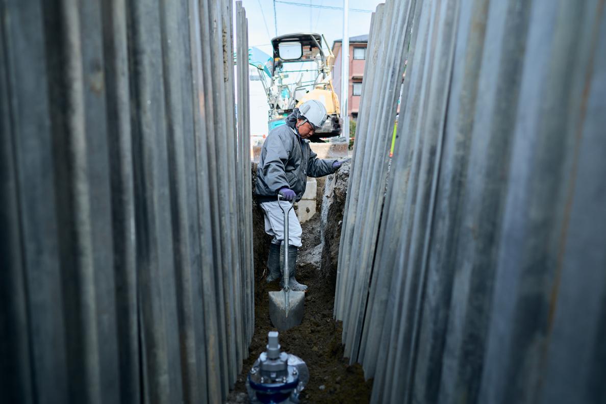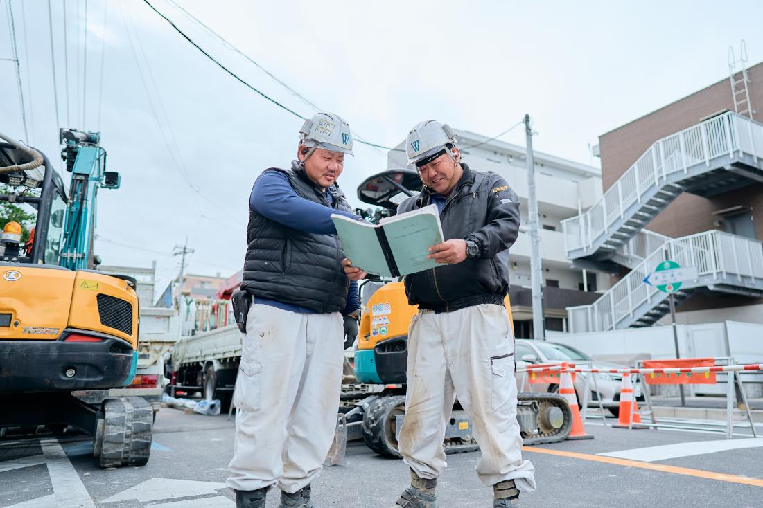 道路規制から重機による掘削、水道管の撤去や新設、埋め戻し、道路復旧まで、すべての工程を一貫して担当します。