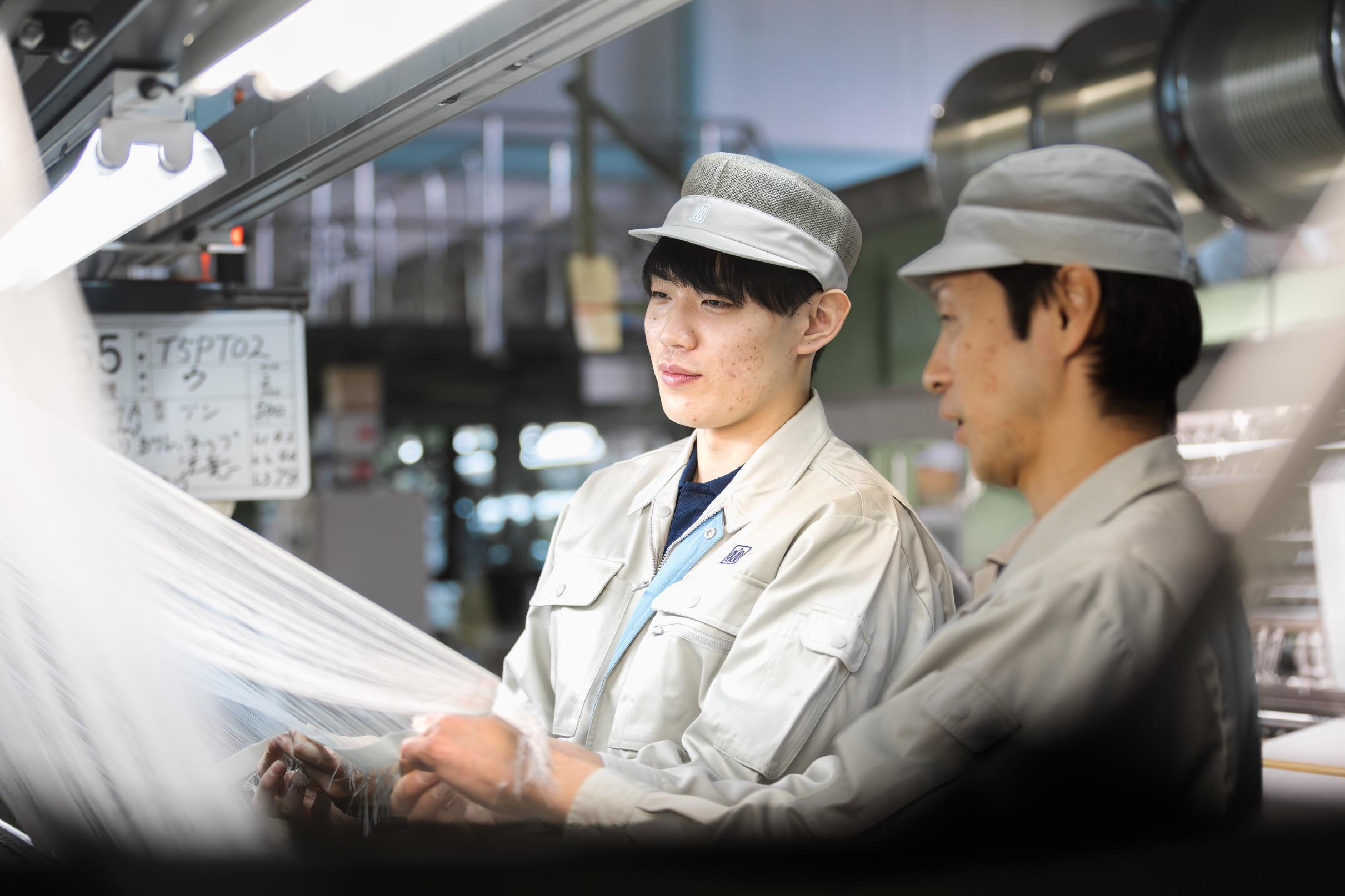 安心の成長ステップ「機械操作は初めてで不安…」という方もご安心ください。当社には、異業種から転職し活躍している先輩が多数。最初は「糸分け」など簡単な作業からスタートし、あなたのペースに合わせてマンツーマンで丁寧に指導します。