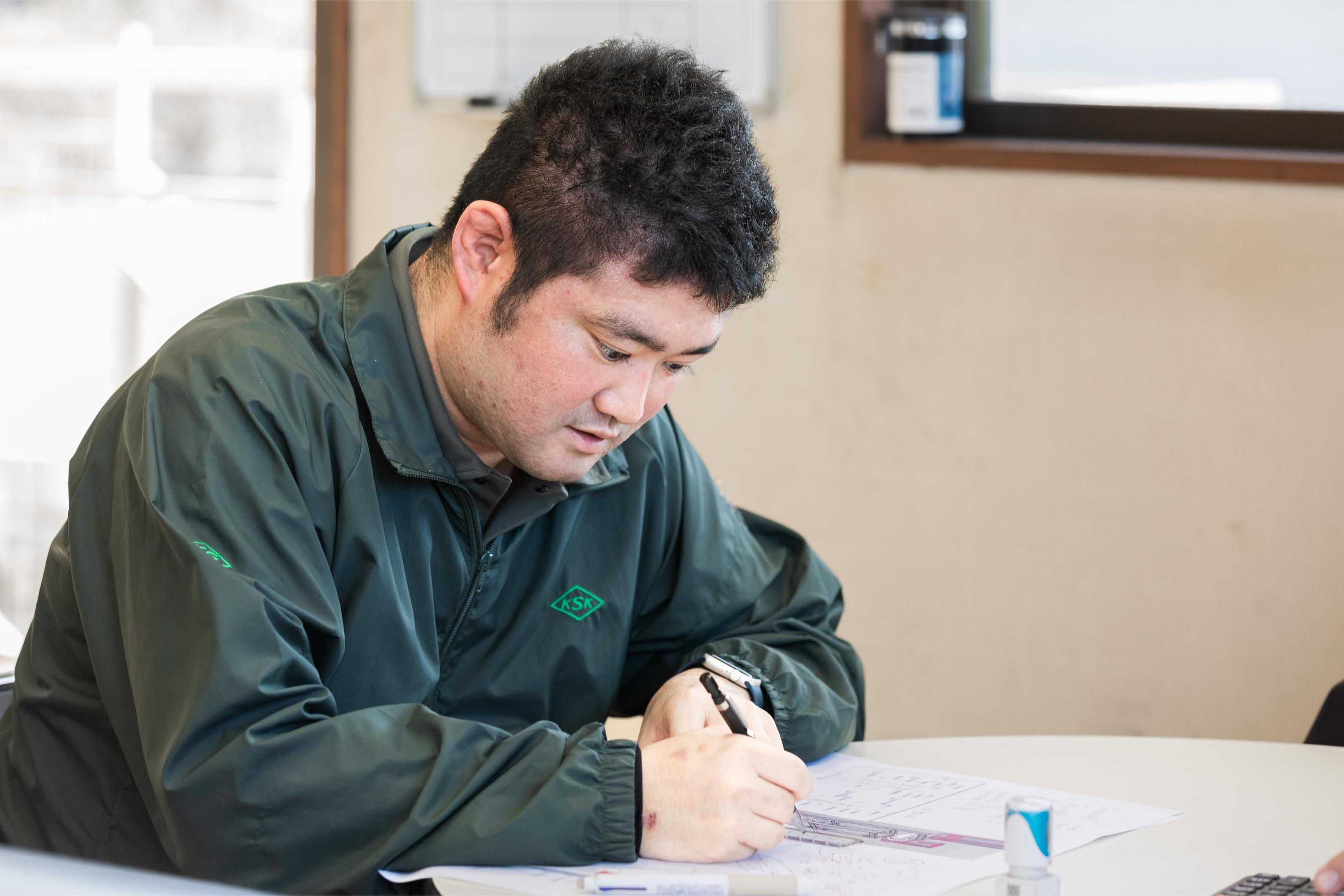 入社後は取締役の林が、あなたの専属トレーナーとして教育を担当します。仕事の進め方はもちろん、複雑な図面の読み方まで、経営の最前線にいるプロから直接学べる贅沢な環境です。約1ヶ月の集中研修で、あなたの成長を徹底サポート。不安を自信に変えてから、実務へと踏み出せます。