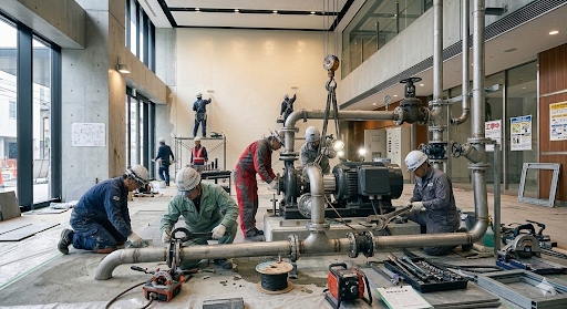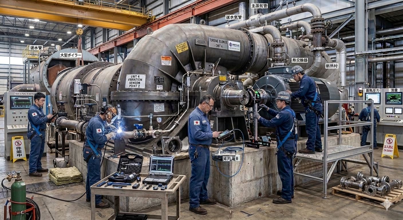 当社の業務は、稼働機器、発電機、回転機械の設置及びメンテナンス作業など、高い専門性を要求されるものが中心です。私たちは、危険予知の書類作成から、部品の精密な測定、回転機の芯出し、配管製作取付に至るまで、細部にわたる作業品質にこだわりを持ち、日本の重要な産業の根幹を、陰ながら支える役割を担っています。