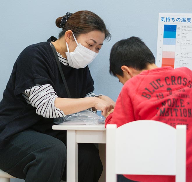児童発達支援では、保護者も同室で参加する個別支援スタイルを導入。子どもの発達支援はもちろん、保護者の不安や悩みに寄り添うことも重要な役割 です。また、集団活動に加えて、マンツーマンの個別支援の時間を設けています。