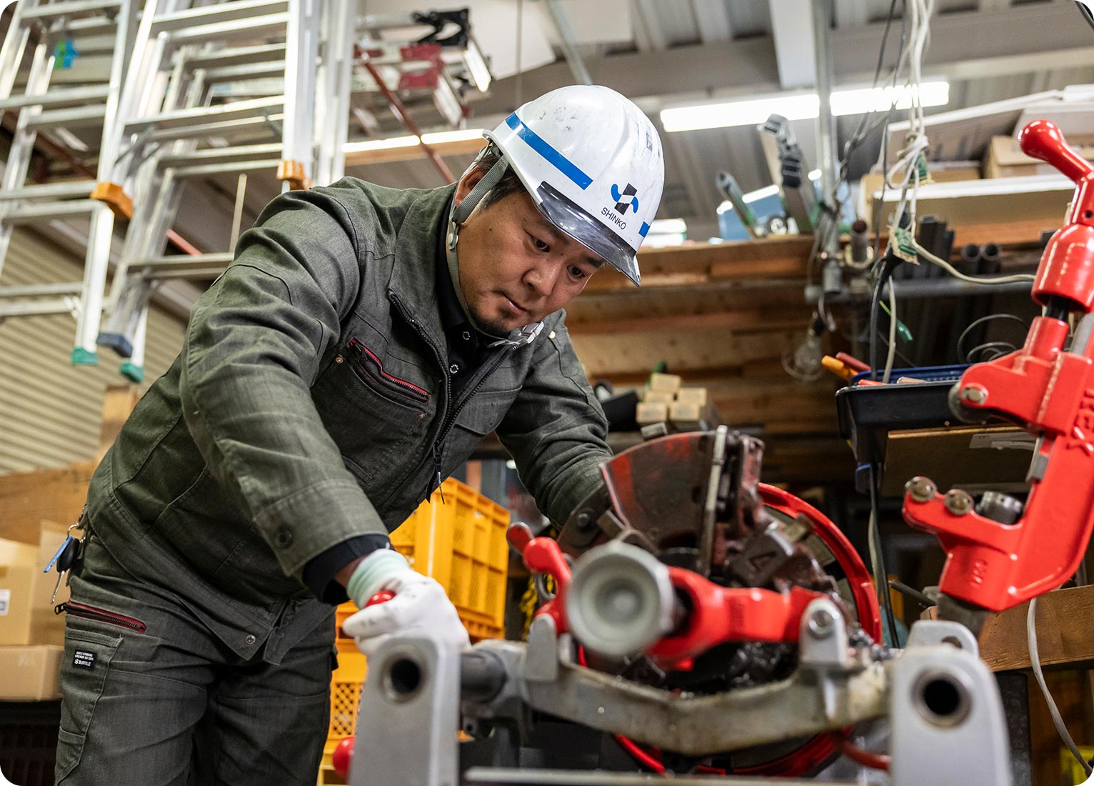 職人としての確かな手応え給排水・衛生設備に加え、消防設備の配管工事も担う幅広い対応力が自慢です。単なる配管作業だけではなく、ポンプや給湯器など、「機器類の設置・更新・撤去」まで一貫して対応できるのが強みです。培ってきた多様な経験を、存分に発揮できる現場がここにはあります。