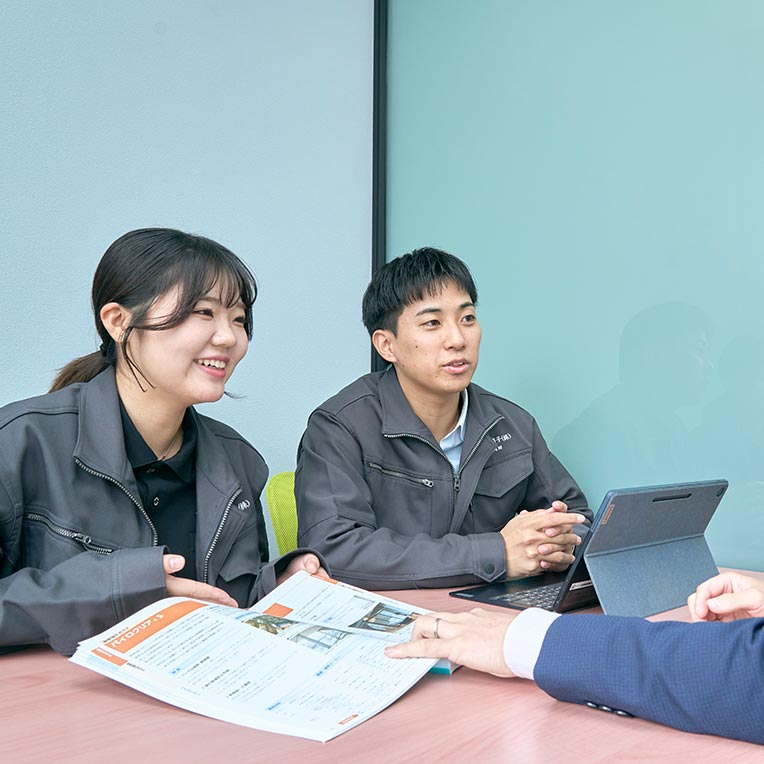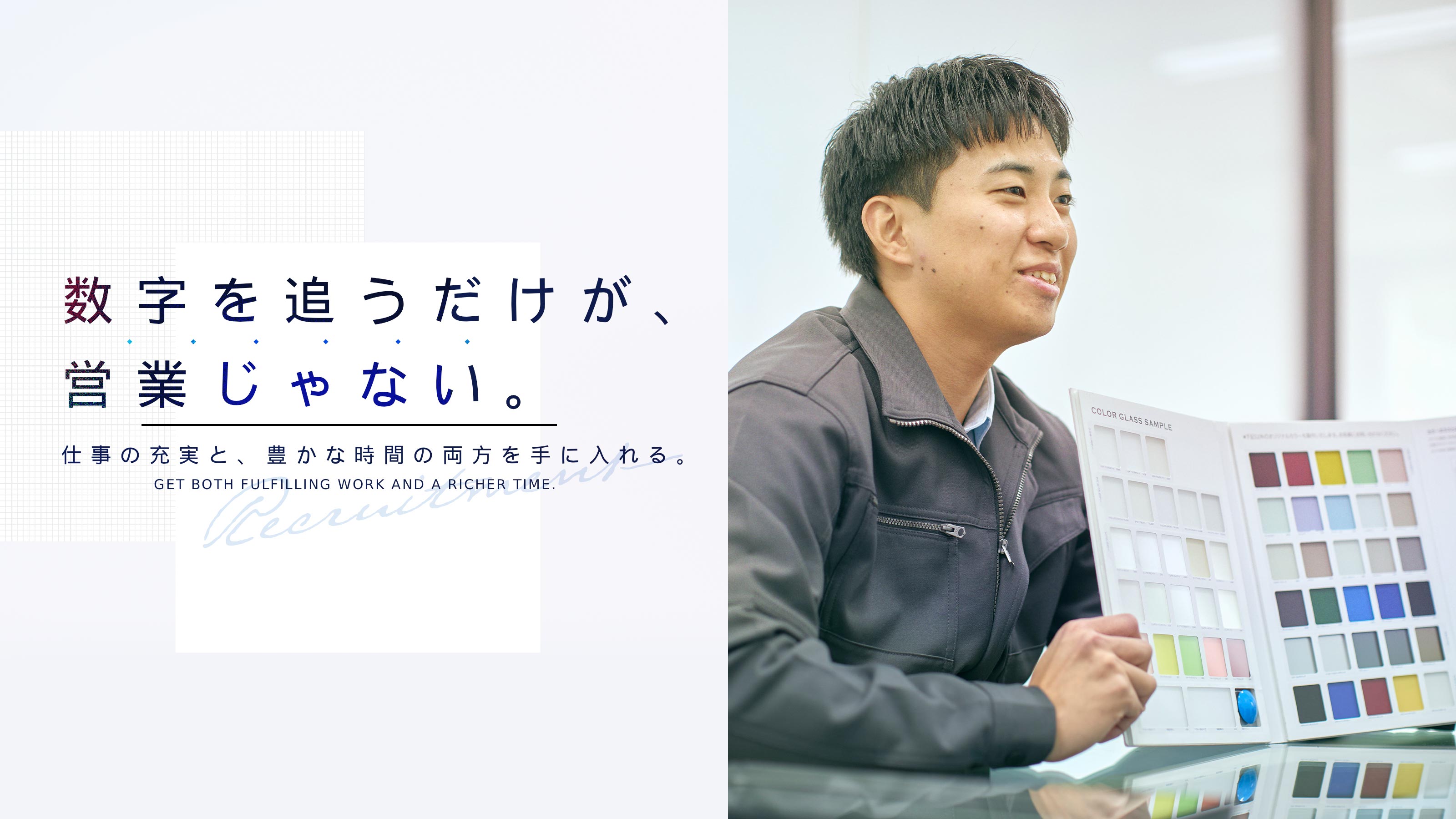 当社が扱うのは、住宅、ビル、公共施設など、さまざまな建築物に使われる窓や建材、ガラスです。人々の暮らしに欠かせない商材を通じて、社会の基盤を支えています。営業活動の中心は、既存のお客様へのルート営業。信頼関係を大切にしながら、ビルダーや販売店といった法人のお客様(BtoB)に向けて提案を行います。また、一般のお客様(BtoC)への直接的な提案も実施しており、幅広い顧客層との関係性を築いています。お客様のニーズに合わせて、メーカーから最適な商品を仕入れ、提案・販売を行うことで、確かな価値を届けています。