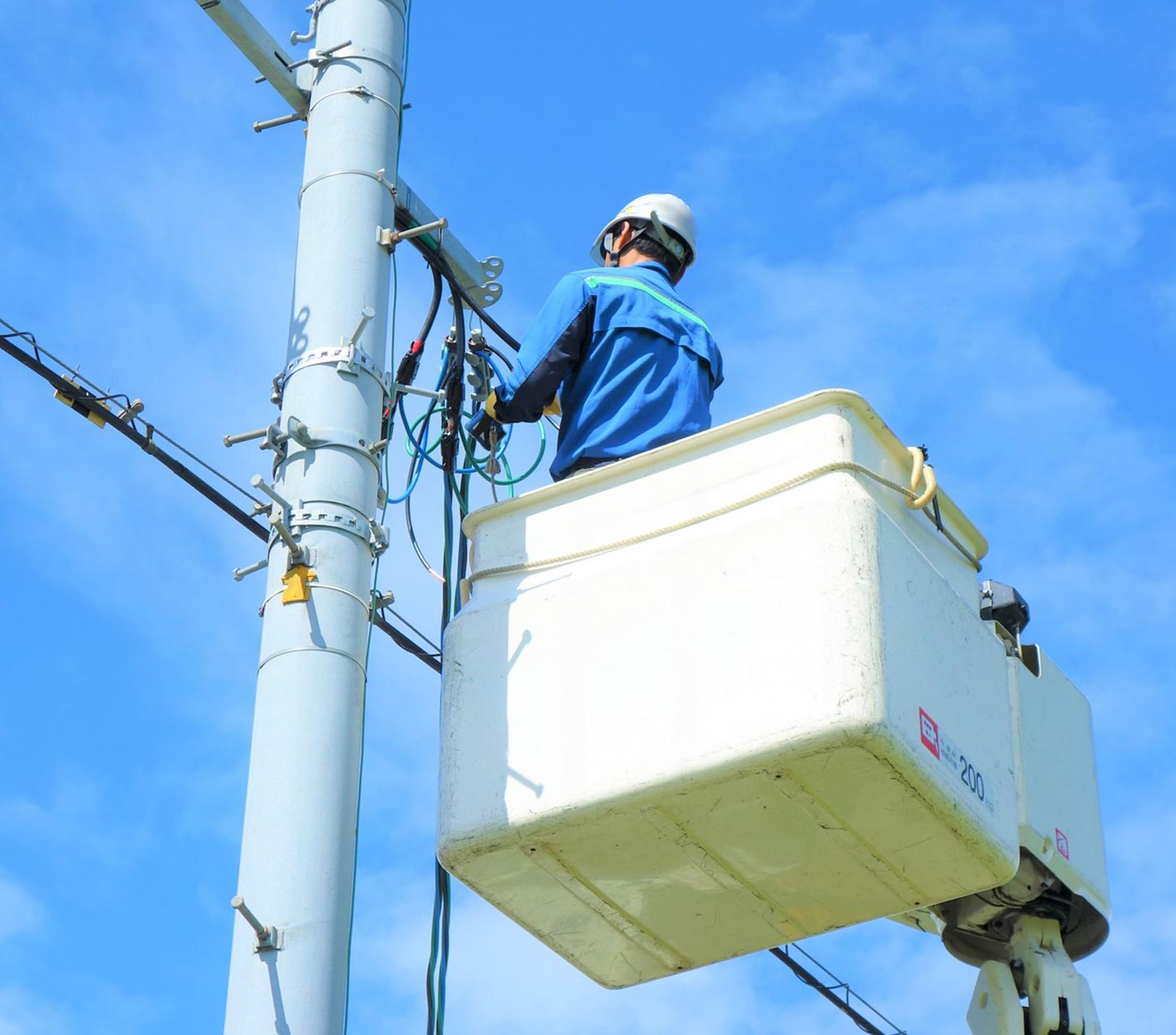 発電所や変電所から各家庭や施設へ電気を供給するための、配電線工事や引込線工事といった地域インフラの根幹を担っています。 高所作業車を用いた電柱上での作業や、複雑な系統連携など、高度な技術と厳格な安全管理が求められる現場においても、熟練の技術者が確実な施工を行います。 台風や豪雪などの自然災害によって断線等のトラブルが発生した際には、迅速に復旧作業にあたり、地域のライフラインを死守します。 島の地形や気象特性を熟知しているからこそ可能な、高耐久かつ効率的な施工手法を選択し、長期的な電力の安定供給を実現しています。
