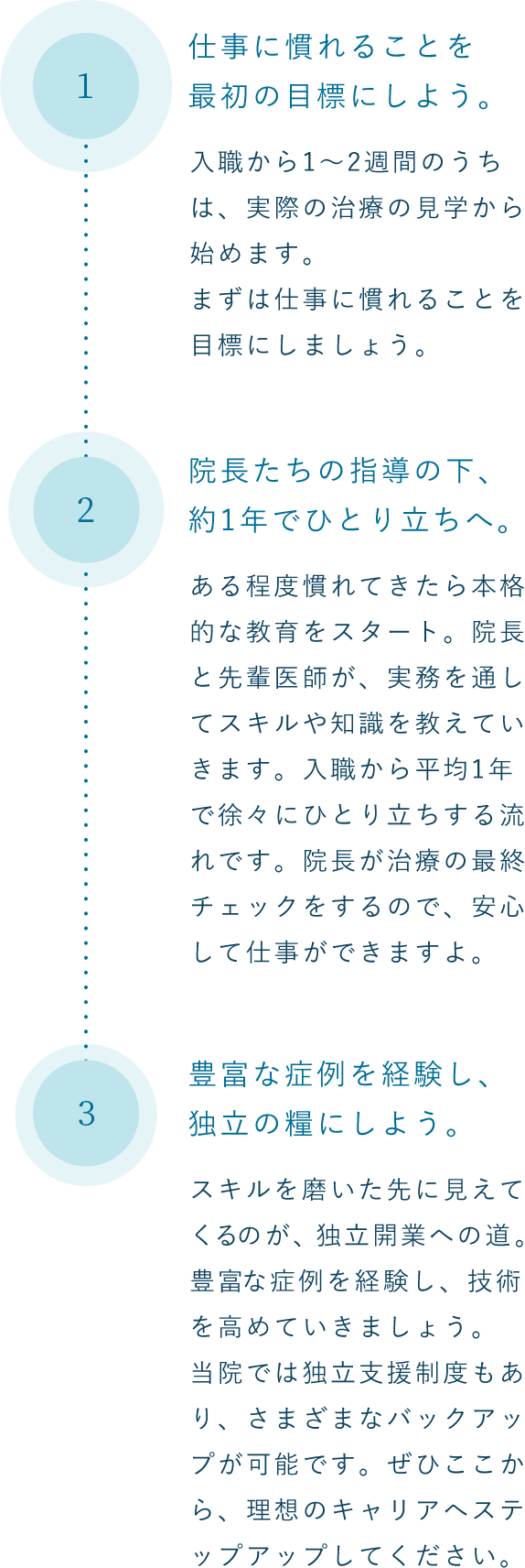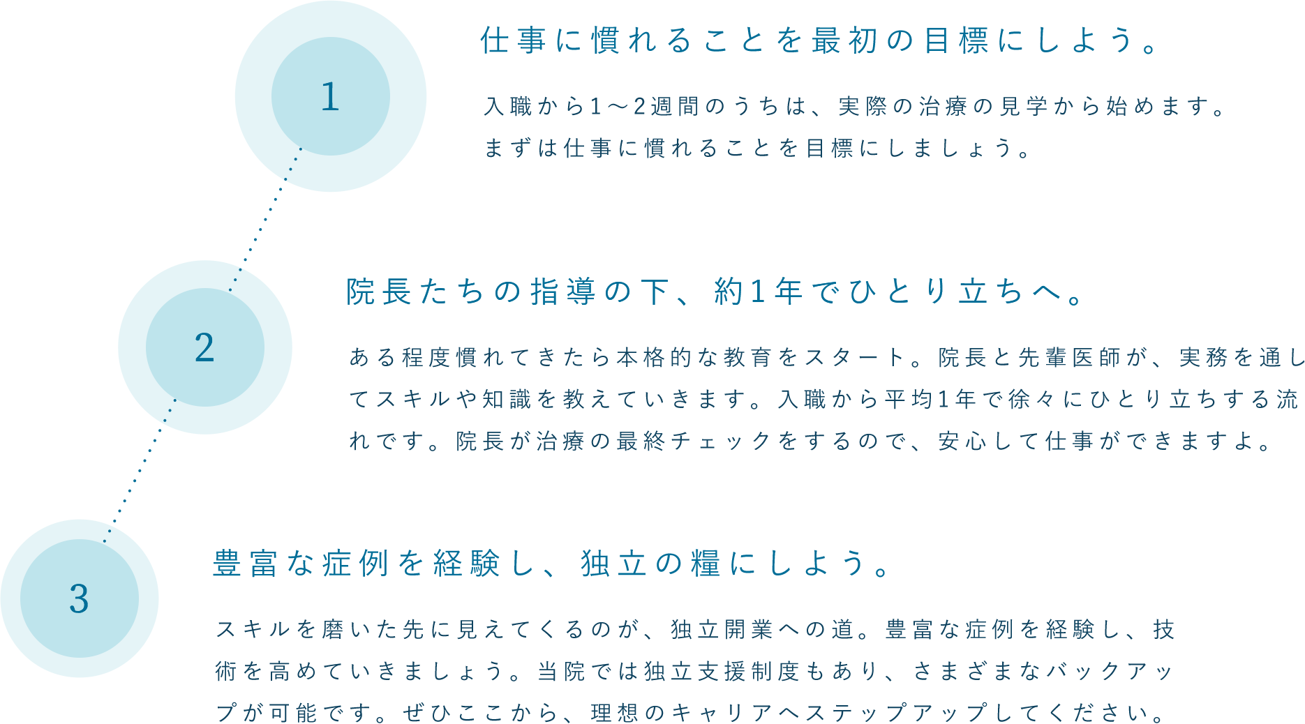 確実に一人前に育てます。【デンタルオフィスみなと】はこれまで、臨床研修を終えたばかりの歯科医師11人を、一人前に育てた実績があります。経験が浅くても問題ありません。きちんと成長できる体制が整っています。