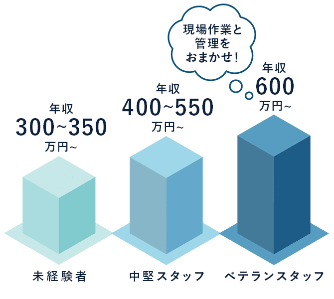 現場を一通り経験した後は、施工管理の仕事にチャレンジすることも可能です。会社負担で資格を取得できるだけでなく、勤務時間中に講習を受けることもできます。過去には、現場作業員から施工管理へキャリアアップを果たしたスタッフも。スキルを磨きながら、仕事の幅を増やしていきましょう!