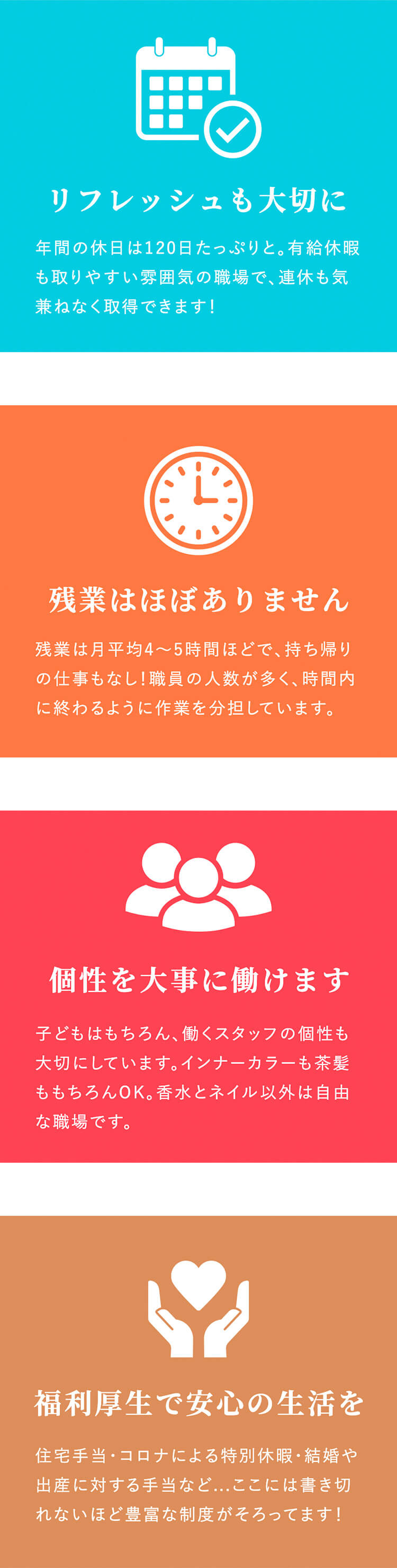 などスタッフの意見は積極的に採用。雰囲気も良く、プライベートの相談も気軽にしやすい職場です。ストレスのない環境で、きっとあなたもスグに馴染んでいけるでしょう。